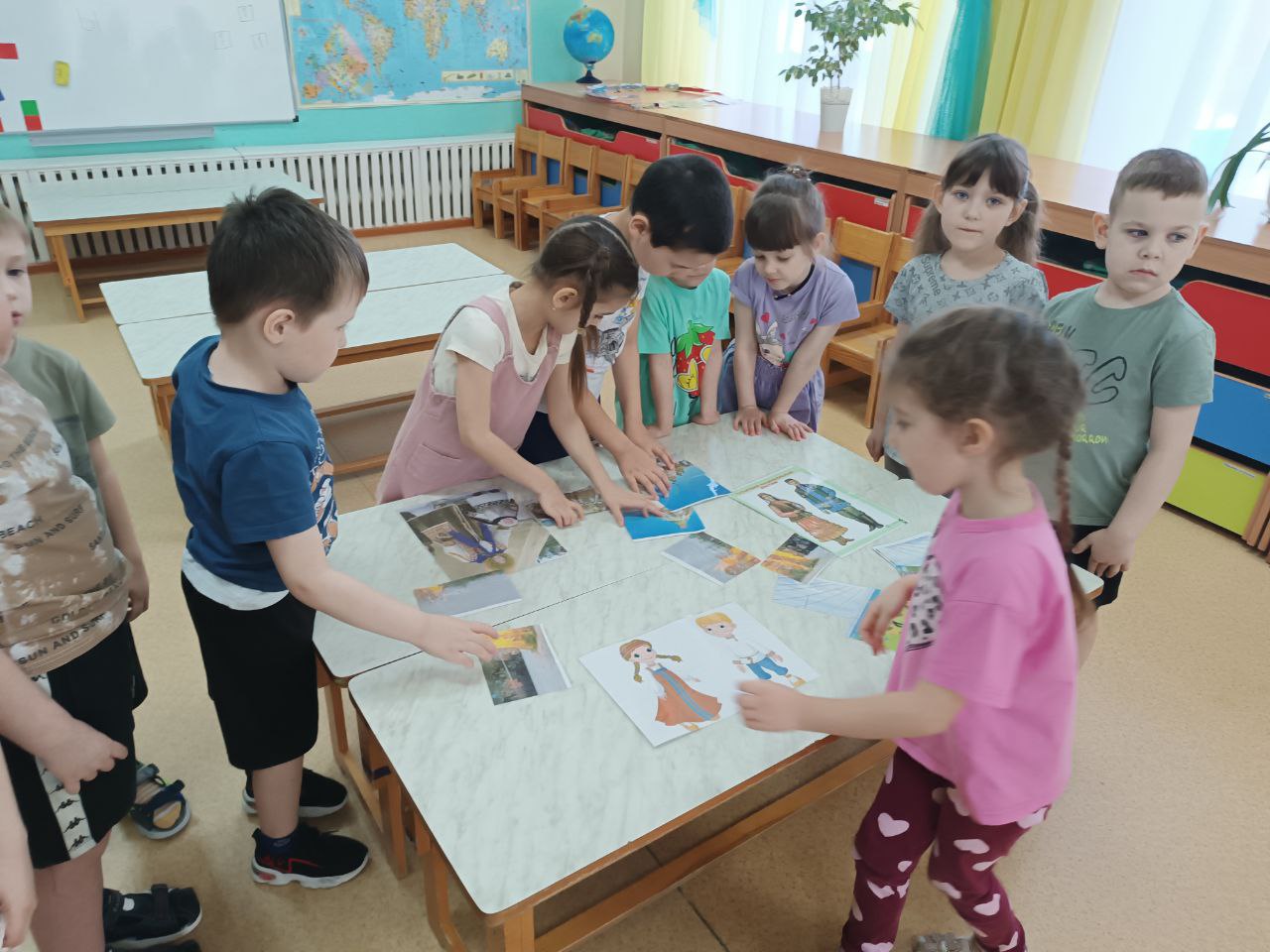 Воспитатель: - Россия - удивительная страна. Она такая большая, что когда на одном конце нашей страны люди ложатся спать, на другом начинается утро. На одном конце нашей страны метут метели и люди топят печи, а на другом - тепло и светит солнце. Чтобы добраться с одного конца на другой на поезде надо ехать 7 дней - неделю, а на самолете лететь почти сутки. Но страна - это не только леса, поля, реки и города. Страна – это, прежде всего люди, которые в ней живут.
